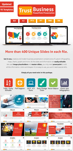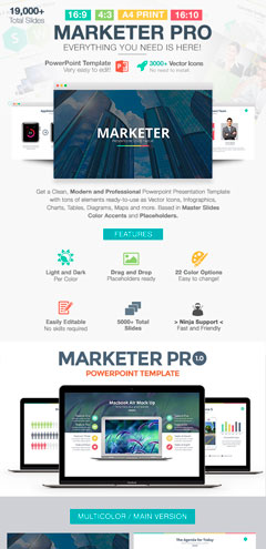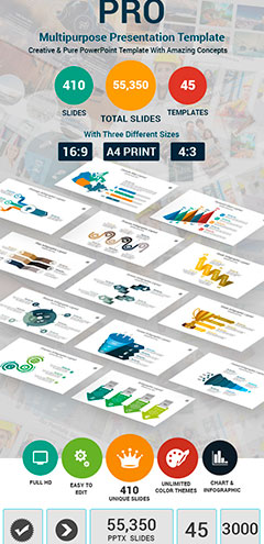 Un ejemplo de esto que comento son las presentaciones en PowerPoint que os sugiero más abajo. Son plantillas editables profesionales para presentaciones de empresa, productos o servicios a precios realmente interesantes, desde 12$, poco más de 10€, podemos encontrar infinidad de plantillas profesionales con distintas variaciones de color, innumerables paginas y estilos.
